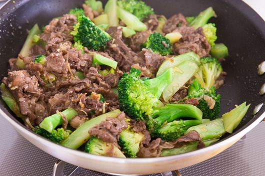 - Cho thịt bò trở lại chảo và xào với súp lơ, thêm hỗn hợp (1) vào đảo đều cho chín, nước xốt sền sệt rồi nhấc chảo xuống.