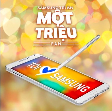 Từ ngày 08/011/2014- 21/01/2014, thành viên của fanpage Samsung Mobile Việt Nam có thể tham gia chương trình “Tôi Yêu Samsung” với tổng giải thưởng là 10 điện thoại thông minh thời trang và hiện đại nhất của Samsung. Các thành viên chỉ cần chia sẻ lên trang cá nhân hoặc trên trang ứng dụng “Samsung. 1 triệu Fan” lý do yêu thích Samsung, gắn hastag #ToiYeuSamsung và tag SamsungMobileVietnam vào statu. (Ví dụ: #ToiYeuSamsung bởi vì... @SamsungMobileVietna m.)