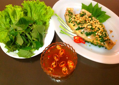 - Rau sống các loại nhặt rồi rửa sạch, để ráo nước. Pha chén nước mắm ớt chua ngọt. Cá điêu hồng chín cho ra đĩa, thoa một lớt mỡ hành lên trên cùng ít đậu phụng rang. Đây là món dễ làm nhưng lại mang đến hương vị lạ miệng, bạn có thể cuốn bánh tráng hoặc ăn cơm nóng đều được.