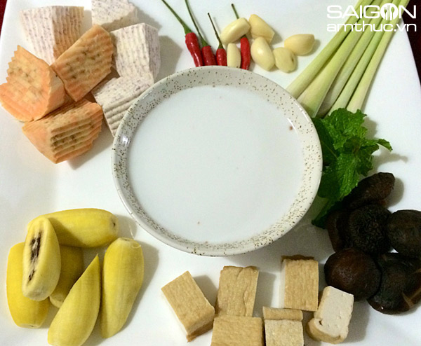 - Gia vị: 3 tép sả cây đập dập cắt khúc, 2- 3 trái ớt hiểm đập dập, 3 tép tỏi thơm băm nhuyễn, nửa muỗng canh hột màu điều, một muỗng bột cà ri, 300gr dừa nạo vắt lấy nước, hạt nêm, đường, bột ngọt, muối, dầu ăn.