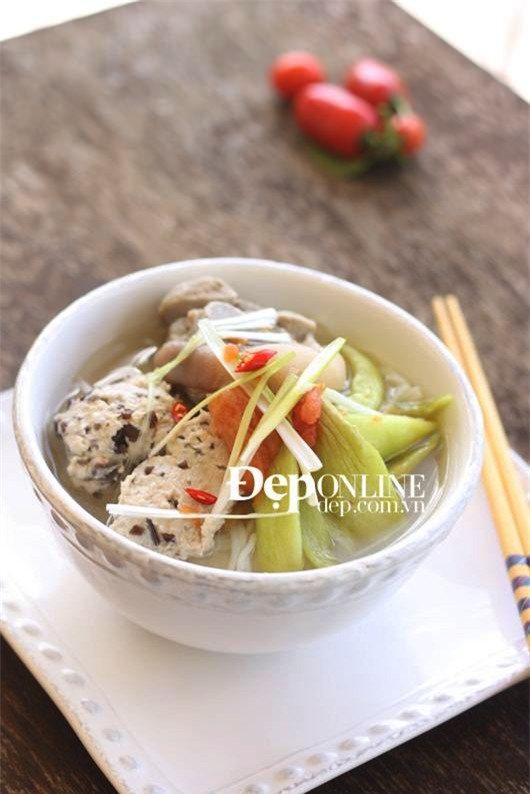- Nấm mèo ngâm nở bằm nhỏ. Trộn nấm mèo vào giò sống, thêm gia vị vào nếu cần (giò sống và nấm mèo dùng làm mọc).Khi nồi nước lèo đã nêm vừa ăn, bạn cho từng muỗng giò sống vào nồi cho đến hết giò sống. Sau khi giò sống đã chín thì vớt ra để riêng.
