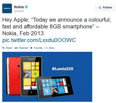 Nokia đã không bỏ lỡ cơ hội này để “đá đểu” đối thủ khi cho đăng tải lên trang Twitter của mình một đoạn thông điệp: “Này Apple: “Hôm nay, chúng tôi công bố một chiếc smartphone nhiều màu sắc, nhanh và giá cả phải chăng” - Nokia, tháng 2/2013”, kèm theo hình ảnh chiếc smartphone Lumia 520 của hãng.