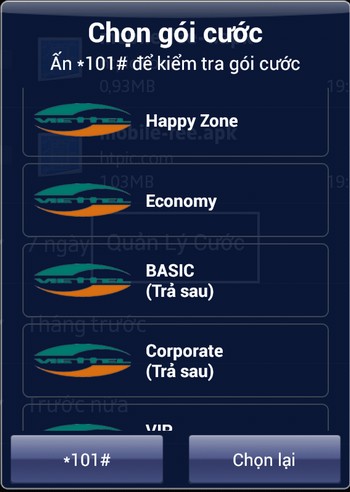 Bước tiếp theo đó là ứng dụng yêu cầu người dùng lựa chọn gói cước dịch vụ tương ứng với nhà mạng mà mình đang sử dụng. Do mỗi gói cước được cung cấp có những mức cước phí (cuộc gọi, tin nhắn, truy cập Internet…) khác nhau, do vậy bạn cần phải lựa chọn gọi cước cho chính xác.