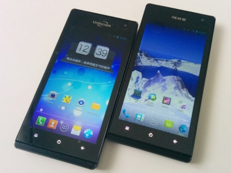 Mặt trước và mặt sau smartphone Arirang AS1201 do Triều Tiên sản xuất (phải) giống hệt smartphone Uniscopre U1201 của Trung Quốc