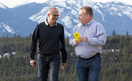 Cựu CEO Stephen Elop (phải) sẽ là người điều hành bộ phận Thiết bị và Dịch vụ của Nokia dưới sự chỉ đạo trực tiếp của CEO Microsoft Satya Nadella