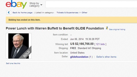 Theo danh sách các tỉ phú thế giới của tạp chí Forbes, tổng giá trị tài sản của ông Buffett được ước tính hơn 65 tỉ USD. Chương trình đấu giá từ thiện đã diễn ra trên trang eBay từ ngày 1-6 đến 19 giờ 30 phút ngày 6-6 (giờ Mỹ)