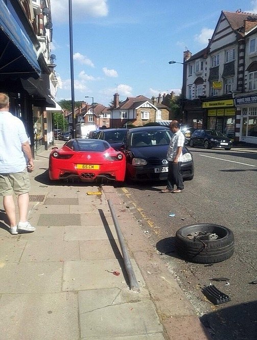 Vào ngày hôm qua, một chiếc Ferrari 458 Italia màu đỏ cũng gặp phải vấn đề trong khi tìm cách đỗ xe tại thành phố này. Trong vụ tai nạn này, siêu xe đến từ nước Ý đã đâm phải một hàng các phương tiện đang đỗ bên lề đường, một ngôi nhà gần đó và một cột đèn.
