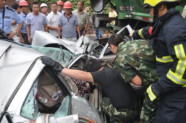 Vụ tai nạn xảy ra vào khoảng 7h30' sáng ngày 21/8 tại tỉnh Chiết Giang, phía Đông Trung Quốc khi chiếc xe trộn xi-măng đi ngược chiều bị mất lái, lật úp và đè vào chiếc ôtô, khiến chiếc ôtô bẹp rúm, biến dạng. Vụ tai nạn khiến nhiều người chứng kiến bàng hoàng.