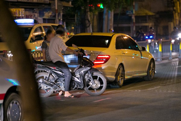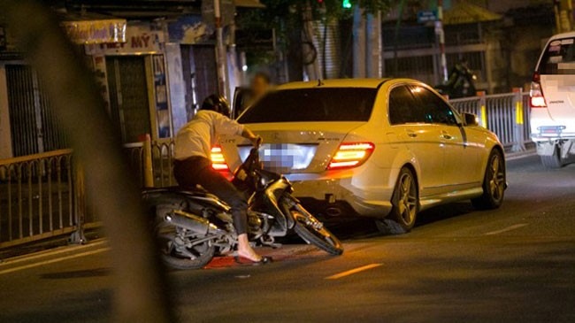 Cú đâm của xe máy đã không ảnh hưởng gì đến chiếc xế hộp.