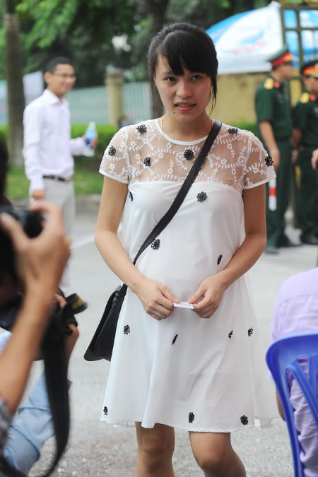 Nguyễn Thị Kiều Diễm 21 tuổi, đang mang bầu tháng thứ tám. Từ 4h sáng cô cùng chồng đã xếp hàng trước cửa Liên đoàn bóng đá Việt Nam để chờ mua vé.