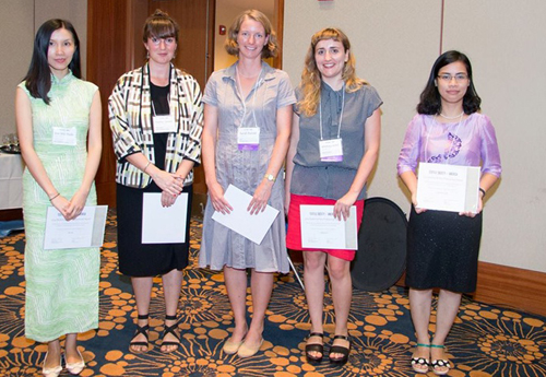 Thạc sĩ Ngọc Anh (ngoài cùng bên phải) cùng 4 người Mỹ tại lễ trao giải ở Los Angeles. Ảnh do nhân vật cung cấp.