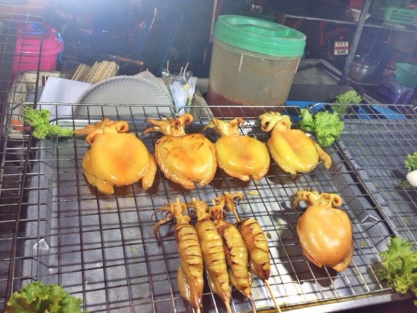 Đồ nướng xiên que cũng sẽ là một trải nghiệm ẩm thực thú vị mà bạn không nên bỏ qua. Người Thái Lan nướng tất cả mọi thứ, từ thịt, cá, trứng, xúc xích tới nội tạng động vật hay rau củ, trong đó món thịt lợn nướng ăn kèm với xôi là món được ưa chuộng nhất. Thịt lợn thái miếng to, nướng cháy và được quết lên một lớp nước dừa đường thơm ngon béo ngậy nóng hôi hổi. Những cửa hàng nước thơm điếc mũi như thế này là lựa chọn hấp dẫn cho các bạn đi du lịch bụi. Chỉ với 10 - 25 baht, tương đương khoảng 7.000 đến 20.000 đồng/xiên nên các bạn có thể ăn thỏa thích mà không sợ thâm hụt túi tiền.