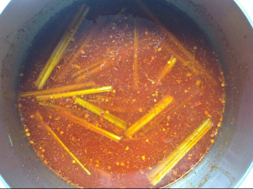 Trộn tất cả các loại gia vị cùng gừng, tỏi, sả đã giã nhuyễn vào nồi nước luộc.
