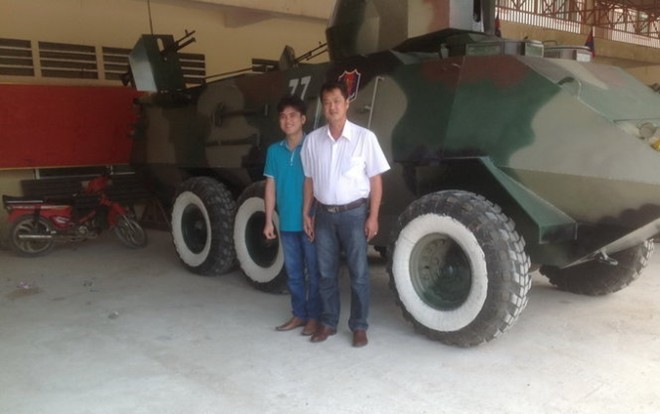 Cha con ông Trần Quốc Hải bên chiếc xe bọc thép tự chế tạo.