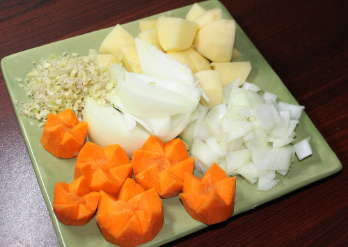 - Rau củ quả gọt vỏ rửa sạch, cắt thành miếng vừa ăn. Sả băm nhỏ. Hành tây: ½ củ thái múi cau, nửa còn lại cắt hạt lựu.