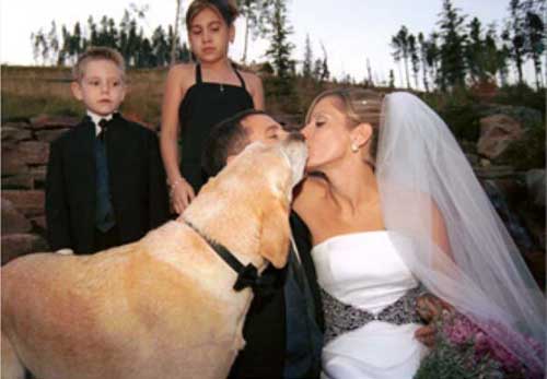 Chú chó dường như muốn "tranh" nụ hôn ngọt ngào của cô dâu với chú rể.