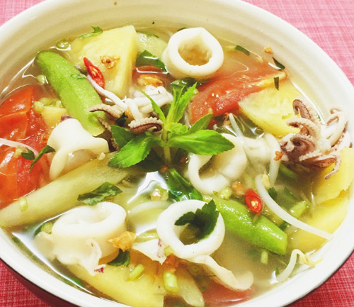 Bước 6: Sau khi nêm nếm vừa miệng, cho các loại rau vào lần lượt như dứa, cà chua, bạc hà, đậu bắp, giá. Khi rau chín, cho phần mực đã xào ở trên vào thêm thìa nước mắm và nêm lại. Tắt bếp múc canh ra tô, rắc chút ngò ôm ngò gai xắt nhỏ lên trên cùng với vài lát ớt xắt và tỏi phi.