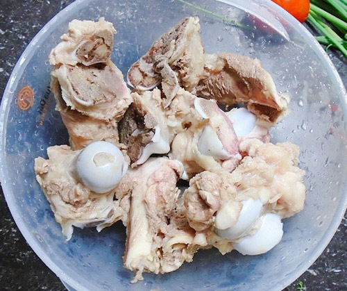 Bước 1: Xương ống luộc sơ, rửa sạch, cho vào nồi ninh lấy nước cốt. (Nên cho ít mắm ngon và củ hành khô đã nướng để nước dùng được thơm).