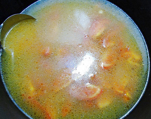 Bước 3: Phi thơm hành khô với chút xíu dầu ăn, cho cà chua vào, nêm 1 thìa bột nêm rồi cho vào nồi nước dùng, đun nhỏ lửa. Nêm gia vị vừa miệng.