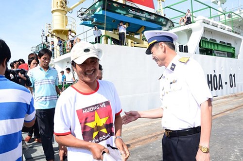 Vùng 4 Hải quân và các ngư dân đã bắt tay thật chặt, ai nấy đều cười rạng rỡ nhưng nét mặt vẫn còn ám ảnh bởi chuyến biển kinh hoàng.