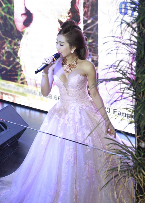 Khi lên sân khấu tŕnh diễn, cô tiếp tục thay váy hồng khoe vai trần