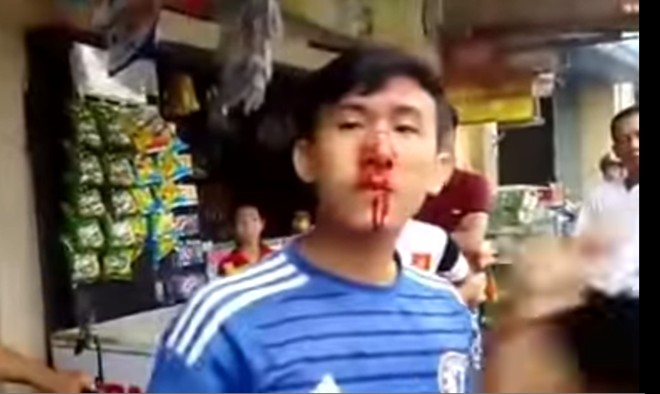 Nam thanh niên bị đánh chảy máu mũi nghi do vi phạm giao thông. Ảnh: Cắt từ clip.