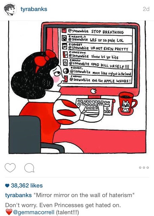 Mới đây, trên Instagram của Tyra đã bất ngờ đăng một bức ảnh biếm họa nàng công chúa bạch tuyết đang xem những ý kiến "ném đá" mình trên mạng với caption: "Đừng lo lắng, kể cả nàng công chúa xinh đẹp cũng vẫn bị những ý kiến ghen ghét".