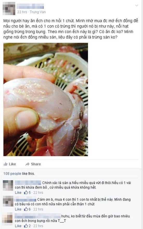 Ngay sau khi những hình ảnh này được chia sẻ, rất nhiều thành viên mạng đều tỏ ra kinh hãi và quyết định "cạch mặt" các món ăn từ ếch. Tuy nhiên, một số người có hiểu biết về vệ sinh an toàn thực phẩm cũng lên tiếng khẳng định với chị đây là trứng sán và cho rằng, hiện tượng này khá bình thường, nếu biết cách sơ chế và chế biến thì sẽ không nguy hại.