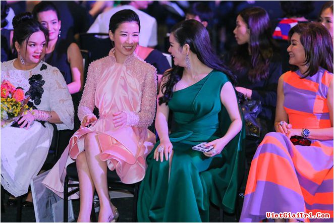 Hoa đán TVB để kiểu tóc ngắn vuốt ướt, diện đầm hồng trẻ trung trong khi "kiều nữ" Việt thả tóc dài và mặc đầm dạ hội xanh tha thướt.