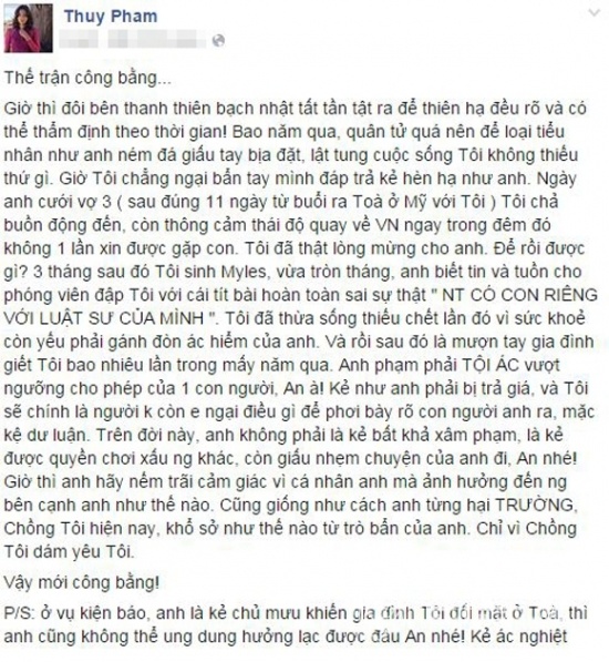 Người đẹp này viết: "Thế trận công bằng... Giờ thì đôi bên thanh thiên bạch nhật tất tần tật ra để thiên hạ đều rõ và có thể thẩm định theo thời gian! Bao năm qua, quân tử quá nên để loại tiểu nhân như anh ném đá giấu tay bịa đặt, lật tung cuộc sống tôi không thiếu thứ gì. Giờ tôi chẳng ngại bẩn tay mình đáp trả kẻ hèn hạ như anh. Ngày anh cưới vợ 3 (sau đúng 11 ngày từ buổi ra toà ở Mỹ với tôi ). Tôi chả buồn động đến, còn thông cảm thái độ quay về Việt Nam ngay trong đêm đó không 1 lần xin được gặp con. Tôi đã thật lòng mừng cho anh. Để rồi được gì? 3 tháng sau đó tôi sinh Myles, vừa tròn tháng, anh biết tin và tuồn cho phóng viên đập tôi với cái tít bài hoàn toàn sai sự thật: "Ngọc Thúy có con riêng với luật sư của mình".