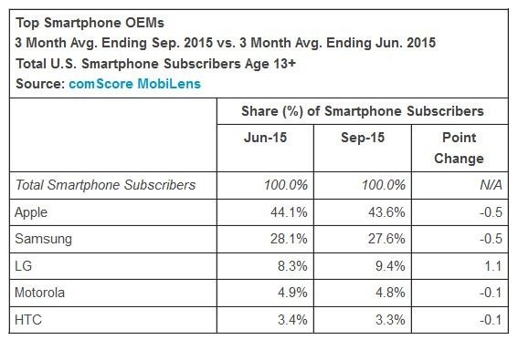 Theo số liệu của comScore, trong quãng thời gian 3 tháng trước ngày 15/9, dù đã bị giảm 0,5% thị phần nhưng Apple hiện đang giữ vững vị trí số 1 trên thị trường smartphone Mỹ với thị phần 43,6%. Samsung cũng chứng kiến một mức giảm tương tự với thị phần 27,6% trong khi đồng hương LG tăng tới 1,1% để đạt mức 9,4%.