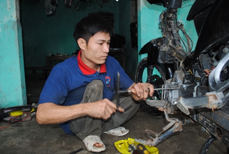 Từ Phủ Diễn (thị trấn Diễn Châu), men theo con đường quanh co tầm 7-8 cây số, tôi tìm về xóm 9, thôn Đông Thọ, xã Diễn Thọ gặp Hùng lúc anh đang bận bịu sửa xe máy cho khách. Phải chờ một lúc lâu, Hùng mới có thời gian sẻ chia câu chuyện về nghị lực vươn lên của chính mình.