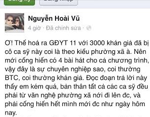 Ngay sau sự việc này, anh Nguyễn Hoài Vũ, người tổ chức tour diễn Giai điệu yêu thương 11 đã đăng trên trang cá nhân đoạn trạng thái thể hiện thái độ bức xúc với phát biểu của Mỹ Tâm. Anh viết: "Ơ thế hoá ra GĐYT (Giai điệu yêu thương) 11, với hơn 3.000 khán giả đã bị cô ca sĩ này coi là theo kiểu phường xã à? nên mới cống hiến 4 bài hát cho cả chương trình. Vậy đây là sự chuyên nghiệp sao? Coi thường BTC, coi thường khán giả. Đọc đoạn trả lời này thấy em kém quá, bản thân tất cả các ca sĩ đều phải từ văn nghệ phường xã mới đi lên được và phải cống hiến hiến hết mình mới được như ngày hôm nay".