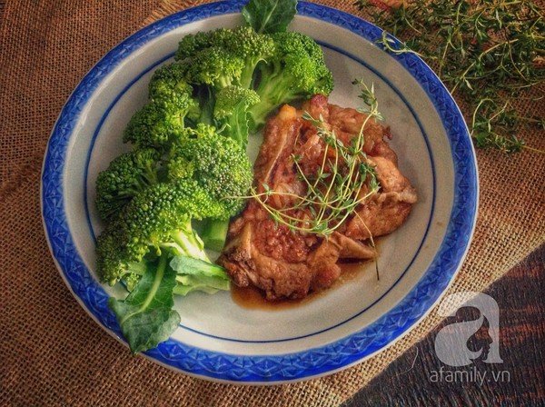 Khi nước sốt sôi, cho phần thịt đã chiên vào và nấu tiếp 10 phút để thịt thấm gia vị. Tắt bếp dọn ra ăn cùng rau củ luộc.