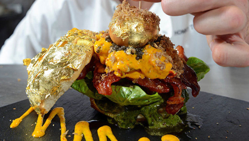 Bánh Honky Tonk Glamburger được phục vụ ở nhà hàng Honky Tonk, London (Anh). Một chiếc bánh có nguyên liệu chính là 220g thịt bò Kobe cắt nhỏ cùng với 60g thịt nai và ăn kèm với loại muối hảo hạng được sản xuất ở vùng núi Himalaya. Bên trong còn có nấm truýp đen Brie và trên cùng là miếng thịt xông khói phủ lớp si rô chiết xuất từ cây thích, trứng cá tầm trắng muối và một quả trứng vịt hun khói bằng gỗ cây mại châu được bọc vàng lá. Ở một số chiếc bánh đặc biệt, người ta còn bọc cả vỏ bánh bằng vàng lá. Để ăn cùng với Honky Tonk Glamburger, thực khách cũng có thể gọi thêm một phần tôm hùm Canada rim với nghệ tây Iran.