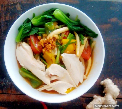 - Khi ăn cho mỳ udon vào tô chan thêm nước sốt rau củ và để gà lên trên cùng.