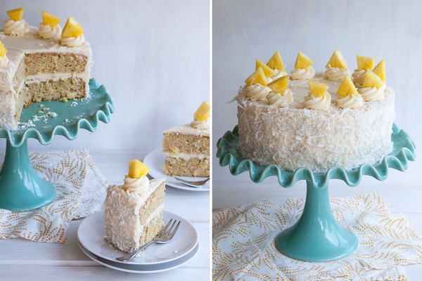 Phủ dừa vụn xung quanh bánh. Phần mặt bánh thì trang trí bằng cách bắt bông kem và xếp dứa lên trên, khoảng cách mỗi bông kem là khoảng 2cm.