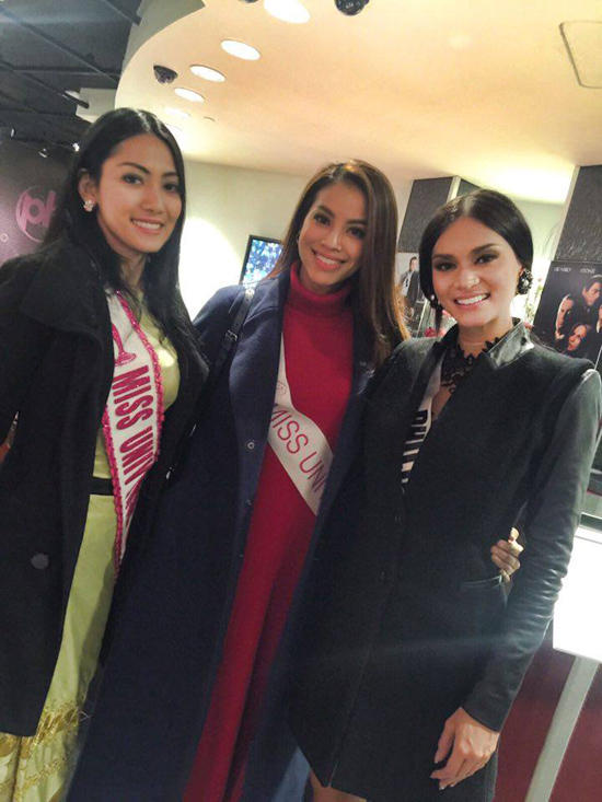 Phạm Hương rạng rỡ bên hai đại diện của khu vực Đông Nam Á. Hoa hậu cho biết, cô may mắn không bị thất lạc hành lý nên tinh thần rất phấn chấn. Thời tiết ở Las Vegas lại khá đẹp và dễ chịu. Một số Hoa hậu các nước cũng đã đến Mỹ như Hoa hậu Curacao.