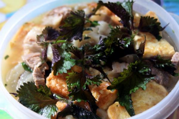 – Hành lá xắt khúc ngắn; Tía tô lá lốt, ngò gai thài chỉ.