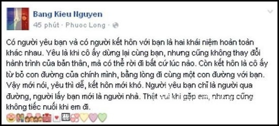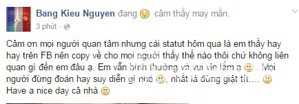 Tuy nhiên vào ngày 13/1, Bằng Kiều đã chia sẻ một status đầy ẩn ý khiến mọi người nghi ngờ mối quan hệ của anh và Dương Mỹ Linh đang có vấn đề.