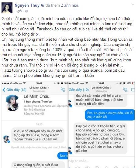 Trước vấn đề này, hotgirl Thúy Vi - "người thứ ba" xen vào giữa chuyện tình của Midu và Phan Thành đã bất ngờ lên tiếng nhằm vạch trần bộ mặt thật của cô gái có nick name Lê Minh Châu tố Mạc Hồng Quân ăn quỵt tiền và chửi người yêu cũ là Ly Kute. Theo đó, nữ sinh 17 tuổi cũng đăng tải loạt tin nhắn, tiết lộ thông tin Lê Minh Châu nhờ cô tạo scandal để cô gái kia được nổi tiếng, bán hàng đắt khách để kiếm tiền vì cô rất cần tiền. Tuy nhiên, Thúy Vi một mực từ chối và bênh vực Mạc Hồng Quân.