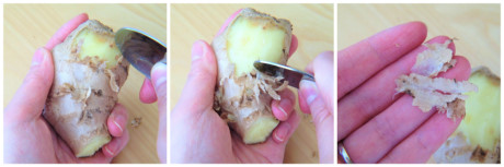 Thao tác rất đơn giản: một tay cầm củ gừng, tay kia nạo vỏ bằng thìa con. Và thế là xong, vỏ gừng sẽ dễ dàng “tuột” ra. Sau đó, bạn chỉ cẩn rửa qua và thái lát để dùng.