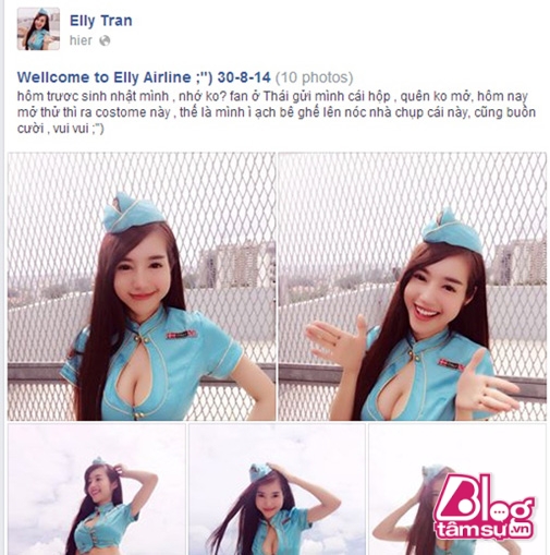 Quà tặng của fan Thái là một bộ đồng phục tiếp viên hàng không màu xanh dương. Tuy nhiên, bộ cánh được thiết kế cách điệu và có đôi phần gợi cảm để khoe ra được lợi thế cơ thể là ṿng 1 căng đầy nóng bỏng và ṿng eo con kiến của ḿnh. Những h́nh ảnh của Elly Trần diện bộ đồng phục này khiến không ít người phải xuưt xoa khen ngợi.