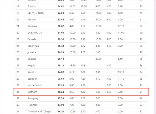 Điểm số của Việt Nam trên bảng xếp hạng Grand Slam.