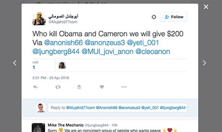 Viết bằng thứ tiếng Anh bập bẹ, hắn ta kêu gọi: “Ai giết Obama và Cameron, chúng tôi sẽ thưởng cho 200 USD... Hãy gia nhập tổ chức Nhà nước Hồi giáo (IS) trước khi xảy ra một cuộc tấn công giống như Paris".