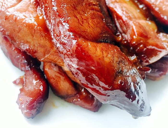 Thành phẩm thịt nướng khi ra lò, có màu mật ong và mùi thơm ngọt ngào, các miếng thịt bóng căng mỡ màng.