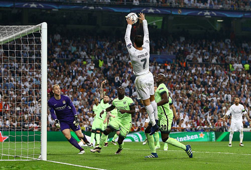 Sau đó, bóng đến chân của Pepe và hậu vệ này nhanh chóng tạt bóng ngược trở lại giúp Ronaldo có được cơ hội ghi bàn. Thế nhưng, siêu sao người Bồ Đào Nha lại có hành động cực kỳ hài hước khi dùng tay thực hiện động tác “úp rổ” như trong môn bóng rổ để đưa bóng vào lưới Man City .