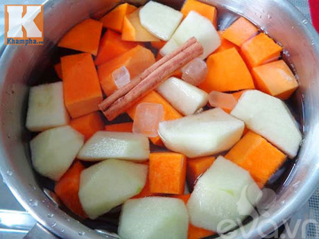 Cho vào nồi cùng với nước, quế, đường. Bắc lên bếp, hầm lửa hơi nhỏ, cho bí và táo chín mềm thì tắt bếp. Vớt bỏ thanh quế.