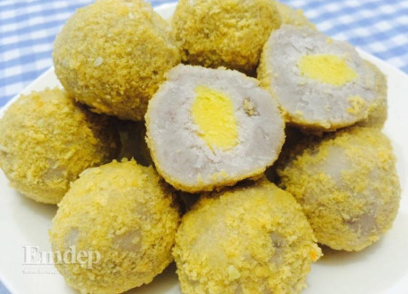 - Cho lòng đỏ trứng vào giữa bột khoai môn, vê tròn lại. Sau đó bạn lăn qua bột chiên xù, nhớ phủ thật đều nhé! Cuối cùng cho lên chảo chiên vàng là có thể thưởng thức rất ngon miệng rồi đấy!