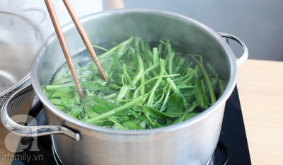 Cho rau muống vào luộc trong 1 phút, đảo để rau chín đều.
